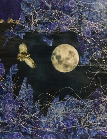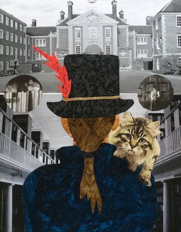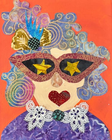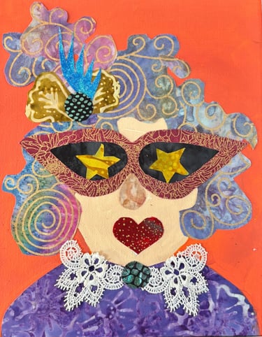 These are original collages composed of textiles, paper , acrylic paint, ink and whatever I find that ticks the box and sticks to the canvas.