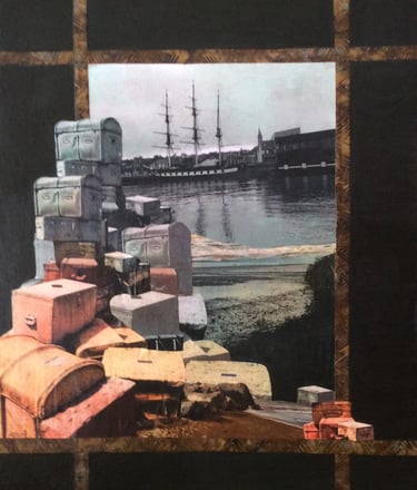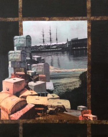 These are original collages composed of textiles, paper , acrylic paint, ink and whatever I find that ticks the box and sticks to the canvas.